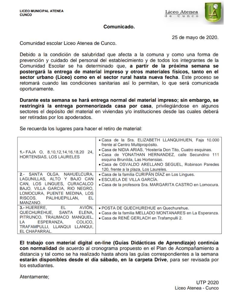 Debido a la condicen de salubridad que afecta a la comuna y como una forma de prevención y cuidado del personal del establecimiento y de todos los integrantes de la Comunidad escolar se ha determinado que, a partir de la próxima semana se postergará la entrega de material Impreso y otros materiales físicos, tanto en el sector urbano (Liceo) como en el sector rural hasta nueva fecha. Este proceso se retomará cuando las condiciones sanitarias así lo permitan. lo que será comunicada oportunamente.